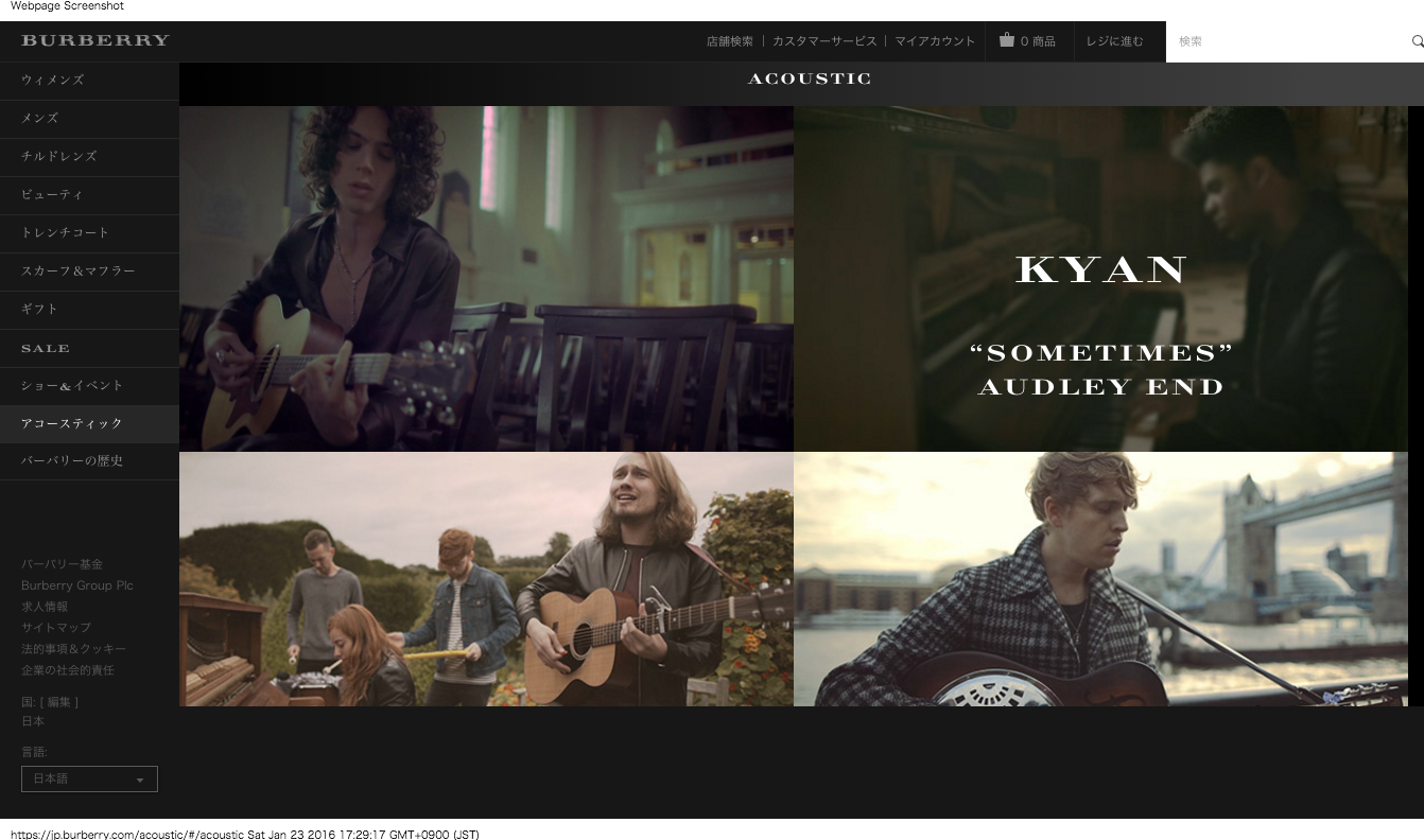バーバリー公式サイトの「アコースティック」のタブには、支援したミュージシャンたちの動画が