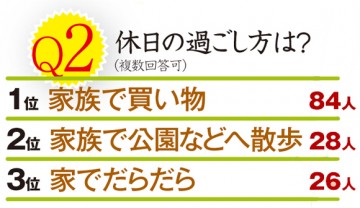 お次は<Q2>「休日の過ごし方は?」で多かったのは「買い物」。場所は「近所のスーパー」や「ショッピングモール」が多い。「パン屋」も2人が挙げたが、「米屋」は0人。