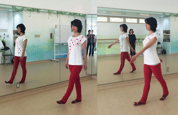かかとが開いていると、お尻もだらしなく開いてしまいます。内股で歩くことイコールお尻が大きくだらしない形になるということです。お尻の穴をキュッと引き締めるだけで、自然にヒップは上がり、足が長くまっすぐになります。