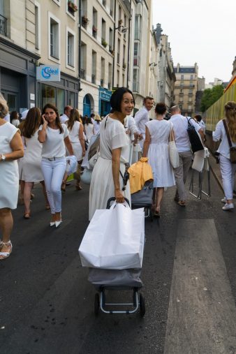 指定の場所への集合は午後7時半ですが、6月のパリは夜10時過ぎまで明るい。気候も穏やかでとても過ごしやすいときです。  ディナーに必要なものは参加者がすべて自分たちで持って歩いて会場まで運びます。カップルでの参加が必須なので、2人分の食べ物とお皿、脚付きのグラス2客、白い布のテーブルクロス、ナプキン、カトラリー類。大きなゴミ袋も携帯します。  食器やグラス、カトラリー類はプラスティックではなくて、なんと本物を用意。テーブルをロマンティックに演出するキャンドルやグループによっては白い風船、オブジェなども持参します。大荷物なので、運ぶのはカートが便利。  たいてい食器や飲み物、食事類は女性陣が、ディナーのためのテーブルや椅子は男性陣が運びます。大きな白いビニール袋の中身はシャンパンやワインに氷。即席のワインクーラーというわけ。お料理は前菜とメイン、サラダにチーズ、デザート、パンといった感じです。