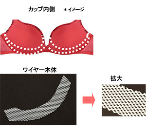 この「ワンダーメイク」は、柔らかいメッシュシート状のワイヤー「ワンダーワイヤー」をカップに内蔵して、“面”でバストを支えるそう。同社アンケートによると、モニターで着けた女性の9割以上が、「付け心地の楽ちんさ」と「シルエット」に満足しているそうです。