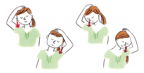 顎関節症を改善・予防するストレッチ●鼻を脇にじっくり近づける。下ろした手は床に向けて伸ばす。(左右各30秒×3回) ●耳をじっくり肩に近づける。下ろした手は床に向けて伸ばす。(左右各30秒×3回) 【監修/日本歯科大学顎関節症診療センター長・原節宏さん】