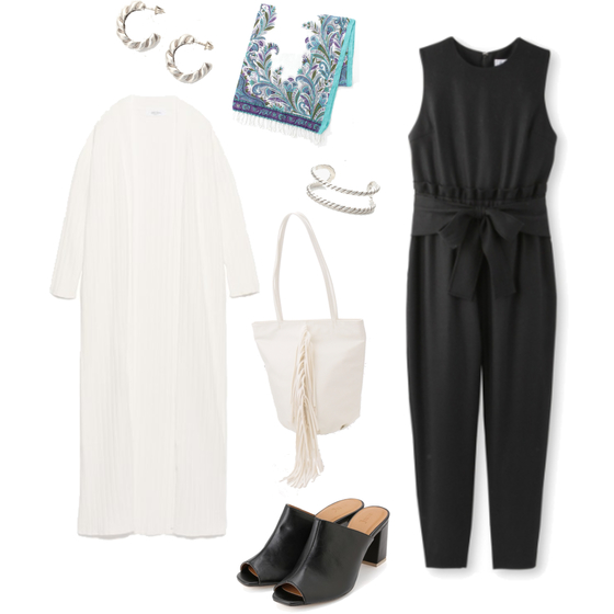引き締めカラーをセレクトPONTEスタイリスト:Pontenao 楽してオシャレアイテムオールインワンとロングカーデのシンプルコーデ。ベーシックなスタイルにボタニカル柄のストールをオンするだけで一気にエレガント。柄の服が苦手という方や初心者におすすめのコーデです!