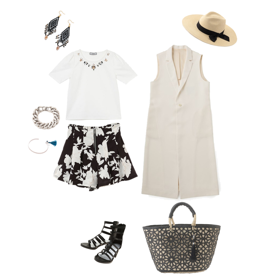 マニッシュなアイテムをプラスPONTEスタイリスト:freedomrose 大人っぽいボタニカル柄のショートパンツには、トレンチコートの進化系・ジレンチをオンしてちょいマニッシュに。色を抑え、ハンサムに仕上げるのがイマドキです!