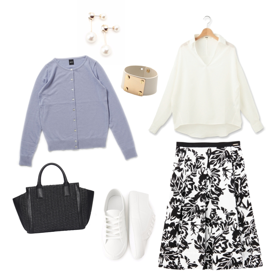 スニーカーでカジュアルダウンPONTEスタイリスト:Pontenao 女性らしいスキッパーシャツとボタニカルのスカートにスニーカーを。清潔感のあるホワイトのスニーカーならキレイ目にカジュアルダウン。キレイ目なかごバックもマッチします。ダスティカラーのカーディガンを肩掛けアクセントに! いかがでしたか? ボタニカル柄はそれだけで存在感があるので、合わせるアイテムはシンプルに抑えるのがポイントです! 今年らしいハンサムな印象のボタニカルコーデを、ぜひ楽しんでみてください