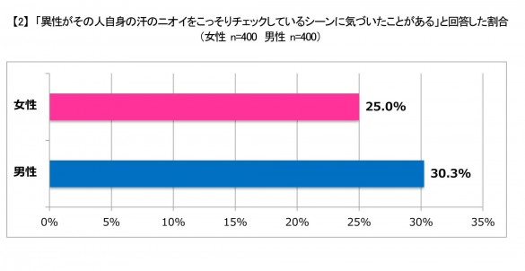 「女性が自身の汗のニオイをこっそりチェックしているシーンに気づいたことがある」と答えた男性 は、3割以上! 意外な高打率で男性にバレているのだ。