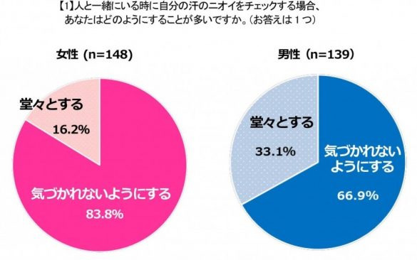 まずは、ニベア花王株式会社が男女800人を対象に行った「汗のニオイチェックに関する意識調査」の結果を見てみよう。