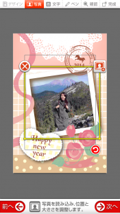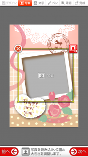 さっそくアプリをダウンロードして年賀状作りを開始! まずは本命の彼の心に訴えかけるデザイン&写真を作ってみました。