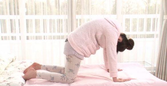 (2)大きく息を吐きながら、猫が丸まるように背骨全体を丸めていきましょう。目線はおへそを覗き込むようにし、お腹に力が入っている事を意識しましょう。