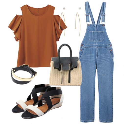 サロペット×オフショルPONTEスタイリスト:mana 断然おすすめはGUのオフショル! 注目のテラコッタカラーに、肩開きのデザインがおしゃれです。アクティブなデニムのサロペを、グンと大人にしてくれます!