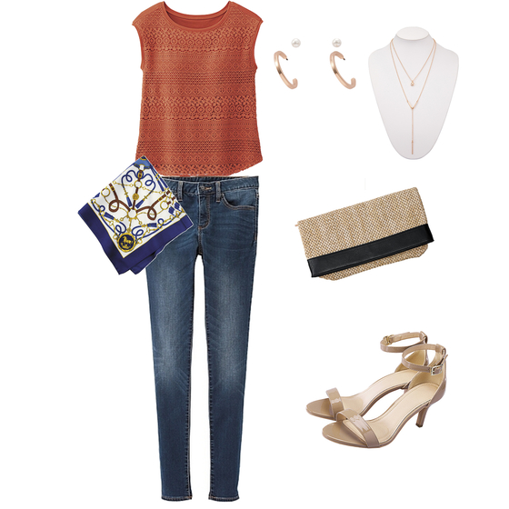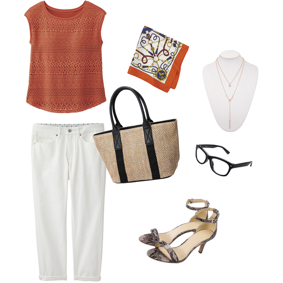 月曜日トレンドのテラコッタ×デニムスタイルのアースカラーにベージュを合わせて。 アンクルストラップサンダルのベージュは、光沢のあるエナメル素材で存在感があるところが素敵。