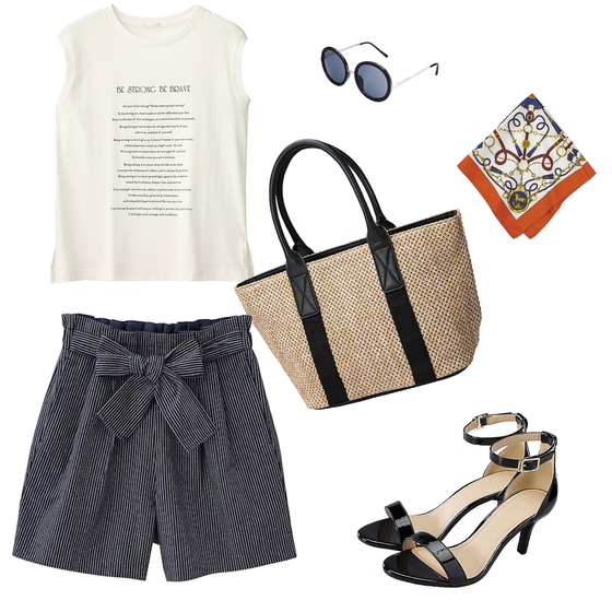 金曜日あつ~い日はショートパンツコーデ。リボンがポイントの短すぎないボトムスはアラサーの強い味方。ブラックエナメルのサンダルがカジュアルコーデに輝きをプラス。定番のブラックは地味にならないデザインで周りと差を付けたい。