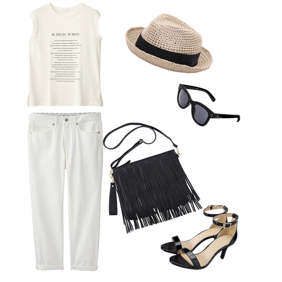 火曜日日差しの強い日はオールホワイトで太陽を味方につけて。今日のグラフィックTシャツはなんと390円の激安!肉厚で長持ちするし、色違いで何色か購入。小物はブラックで統一して大人なコーデに仕上げる。ラフなTシャツスタイルでも、アンクルストラップサンダルならレディなコーデに格上げしてくれる。