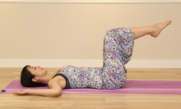 5秒かけて足を下ろしつま先を床につける。5秒かけて元に戻す。ぽっこりお腹に効果的。