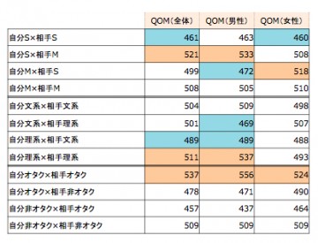 ところが、「オタク×非オタク」のカップルは、すべて平均以下の幸福度でした。なかでも最悪なのは、「男が非オタク×女がオタク」という場合の、男性が感じる幸福度で437点!「うちの嫁は深夜アニメばっかり見て朝起きない」なんてブーブー言われる結婚生活になってしまうわけです。