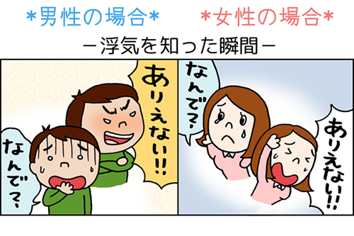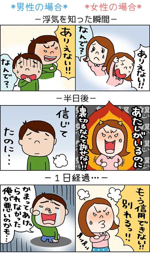 ご注意ください! 浮気によるダメージは絶大!「浮気相手に嫉妬する」「嫉妬で狂いそうになる」「浮気相手もパートナーも両方に嫉妬する」など、女性の回答の中でとにかく頻繁に使われていたキーワードは「嫉妬」でした。「裏切られた」というショックは、やがて「嫉妬」へと姿を変え、パートナーや浮気相手、あるいはその両方へ向かっていくようです。 そしてやがて、「別れる」「二度と信用できない」「そんな男こっちから願い下げ」と最終的に恋に終止符を打つという回答も多かったです。 それに対して男性の回答では「嫉妬」というキーワードは1件しかなく、どちらかというと裏切られた後には虚しさが漂ってるようです。これは明らかに男女の違いと言えましょう。
