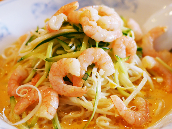 コチラの麺は、夏季限定の涼麺「黄金雲丹(うに)冷し麺(1320円)」。個人的に最も大好きなメニューですが、プラス200円で美容食材「エビ」を3倍に増量することができちゃうんです!
