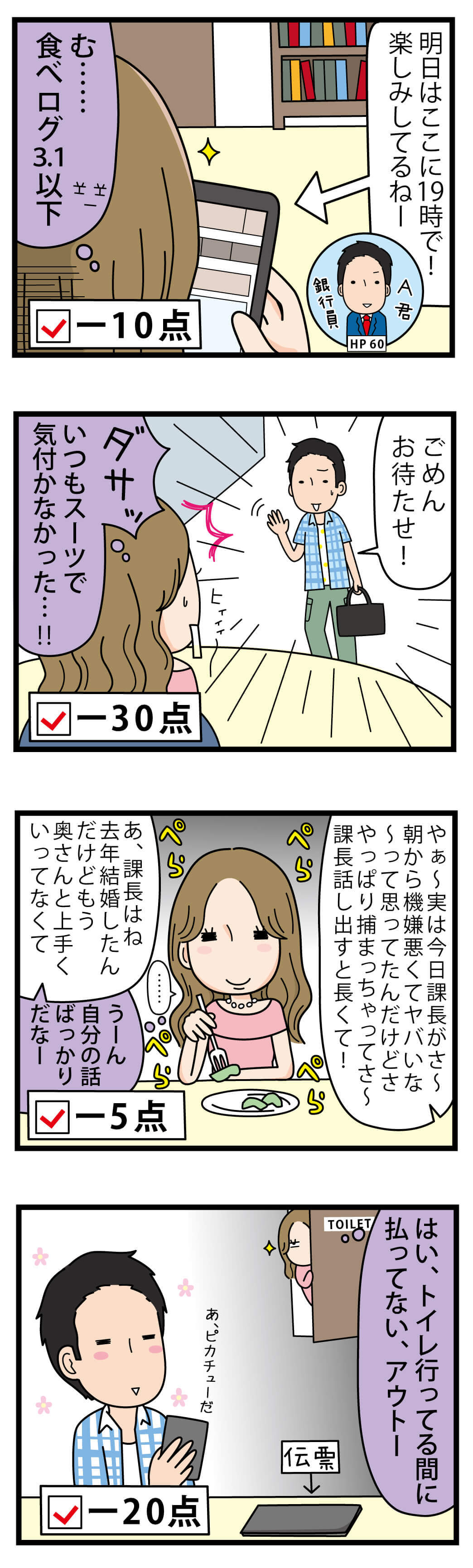 チェック④初デートぐらい奢って欲しい…が多数派人にもよりますが、初対面の初デートってどうしても「減点法」で評価しがちです。お互いに、「あ、これやだな~」のNGスコアが溜まり続けると、「この人とは二度とデートしない」という結論になってしまいがち。 できるだけ、加点法でいきたいものですね。…ああ、初デートってめんどくさい。