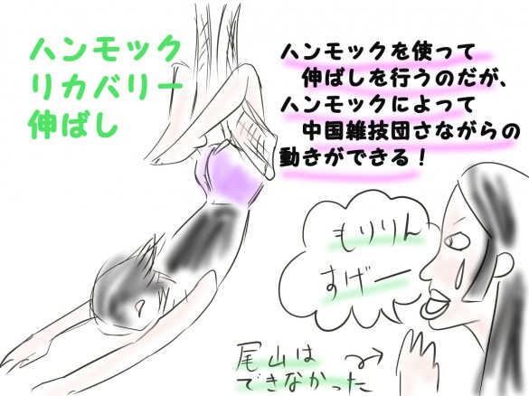 身体の支点をハンモックの支点に合わせ、宙に浮かんでユラ~リ。ハンモックに脚をからませて三日月のポーズ(逆立ちよりも弓なりなポーズ)、ハンモックで腰を支えて足首を掴むポーズ(ブリッジに似たポーズ)etc。