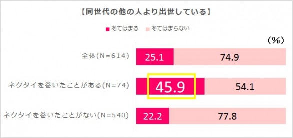 そして、ネクタイ巻き経験者の45.9%が、同世代の他の人より出世している実感があるのだとか。ネクタイを巻いている先輩や同僚を見かけたら、「ダサい!」と思いがちですが、もしかして将来出世する人かも!?