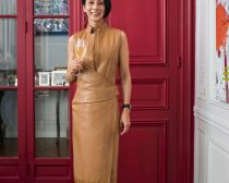 (上写真は、当日の中村さんのファッションで、「ロエベ」の革のワンピース。お招きする側のファッションで心がけるのは、動きやすく、お招きした方に失礼にならないおしゃれ)