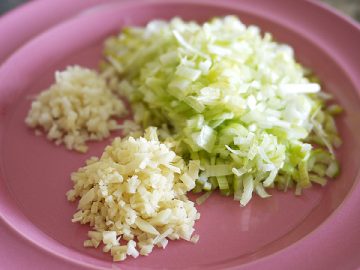 (2)長ネギ、ショウガ、ニンニクはみじん切りにする。