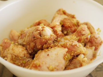 (1)鶏手羽元をよく水洗いして、キッチンペーパーでしっかり水分を取る。この作業によって、鶏肉の汚れや臭みが取れ、嘘のように仕上がりが変わってくる。