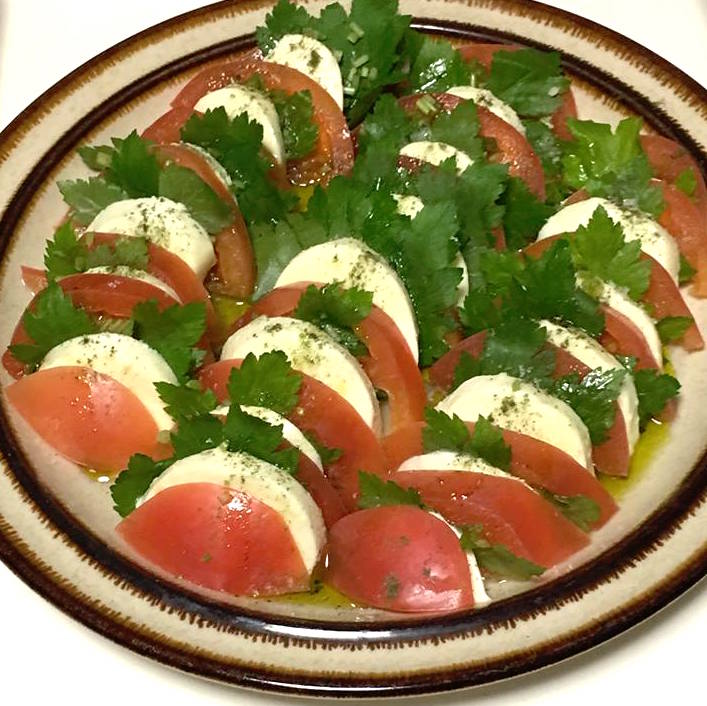 古谷さん作の和ハーブ・カプレーゼ。この1品だけで3色だ! バジルの代わりにシソとミツバ、オイルはヘンプ(アサ)オイル