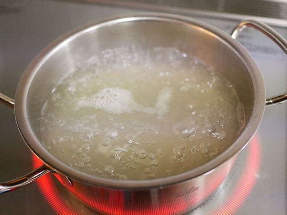 冷たい水に米を入れて加熱をすると、ダラダラとした温度上昇の間に、米に含まれるデンプンが溶け出し、ベチャベチャドロドロのお粥になってしまいます。米粒本来のハリを保ちながらふっくら感を出すためには、表面のデンプンをパキッと糊化させて、内側からデンプンが流出しにくくするようコーティングすることが重要です。