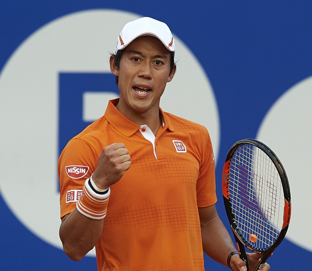 BARCELONA, SPAIN – APRIL 24: Kei Nishikori of Japan celebrates a point against Rafael Nadal of Spain during day seven of the Barcelona Open Banc Sabadell at the Real Club de Tenis Barcelona on April 24, 2016 in Barcelona, Spain. (Photo by Manuel Queimadelos Alonso/Getty Images)