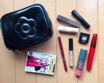 ポーチはマリークワント。MiMCやTHREE、アムリターラなど自然派系コスメにプチプラが混ざっています。