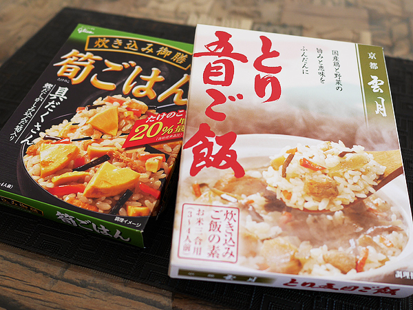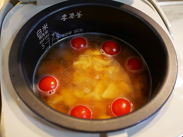 今回は、春らしく「たけのこご飯の素(三合用)」で炊いてみることに。大さじ2程度の水を減らし、代わりにミニトマトを5~6個投入。ミニトマトの代わりに、中玉トマト1個分をざく切りにして加えても良いでしょう。炊きあがりはこんな感じに。
