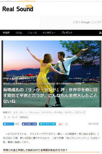 タイトルは「世界中を敵に回す覚悟で平然と言うが、こんなもん全然大したことないね 」。『ラ・ラ・ランド』が好きな人こそ読んでムカつくべき http://realsound.jp/movie/2017/03/post-4278.html