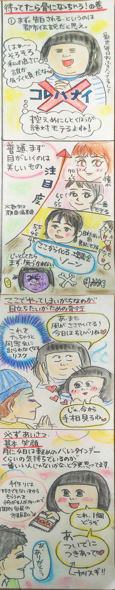 忘れもしない高校二年生の時の夏合宿。  「男女ペアで肝試し」というイベントがあって、誰も私とペアになりたがらない時に(あれ…??)という違和感を覚えたのが、自分がおブスだと気づいたきっかけだったように思います。  狙ってる男子にほんのりとでもいいから良い印象を与えたい!  生意気な美人に振られて弱ってるところをサッとキャッチしたい!!  という、焦る気持ちから思春期から結婚に至るまで散々奇行をくりかえしてしまいました。あの若い過ちのせいで、高校卒業から15年。1度も同窓会に出られていません。  とにかく偏差値42の目指すところとしては、人あたりのいい笑顔。  ここで注意したいのは、初対面に近いところで自分のスイーツ作りのスキルとか小物作りのスキルとかそんなものをアピールしないほうがいい、ということです。2人でどこかに遊びに行くようになるまでは、どうかそのスキルはとっておきましょう。  この、サラッとプレゼント作戦は狙ったオトコのみ。テキトウにばら撒いちゃうと、単に“気前のいいブス”になってしまいます。  目指したいのは気前のいいブスじゃなくて、“オレにだけ気のいいブス”。  これが、おブスが美人を制して、モテる男を捕まえるための第一歩だと思います。気のいいブスになることで、ようやく狩りにエントリーできる。  黙ってるほうがミステリアス感出るかも……と思って喋らずにアイコンタクトのみで過ごしてた時期があるのですが、全くモテず。単なる陰険なブスになってしまいました。ミステリアスな美人はいてもミステリアスなブスはいない。  笑顔だけ安売りして、気のいいブスとしてやってきたらもっとイージーモードだったかも! と、じんわり後悔しつつも今日も唐揚げが美味しいです。