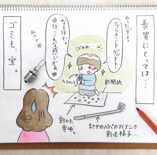 まさかのパパのアイアン! そばには粉々に砕けた電球、うっとり愛おしそうに、電球の中身を見つめている長男・・・。 「これがフィラメントかぁ~!」 こら~! 危ないじゃないー!! 青くなる母を尻目に、長男は、ハンディ顕微鏡で電球の中のフィラメントとやらを覗き込み、夢中で観察中。 叱ろうかと思ったけれど、気づけばちゃんと新聞紙を広げてゴミが床に落ちないように準備していて、うーん、探究心旺盛ということで今回はそのままに。 「またコレクションが増えたぞ!」 とこちらには「ゴミ」でしかないものをにこにこ大切にしている長男です。 ちなみにフィラメントとは電球の中の部品で、電流を通すと白く光る部分。今では白熱電球も珍しくなり、最後の白熱電球だったリビングの照明をチェックしていて、本でしか見たことがないフィラメントとやらを見てみたかったようです。 子どもの価値感って本当に不思議。 母にはあまり理解できないけれど、その探究心は大切にしたほうがいいよね。 それでは、また次回!