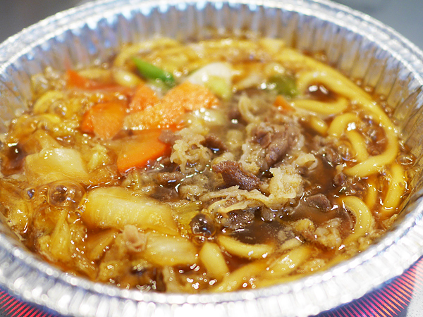 入っているメイン具材は、牛肉、ニンジン、ネギ、白菜、うどん。どの具材も控えめな量でまとまっていますが、そのねらいは「つゆ」を楽しむために設計されているのかもしれません。そうです、確かにつゆがダントツにうーまいっ! つゆだけで白飯が何杯も食べられそうです。