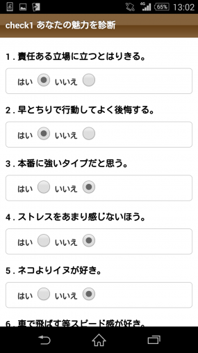 まずは、「あなたの魅力を診断」というぺージから。1ページにつき全10問で、「責任ある立場に立つとはりきる?」や「ストレスをあまり感じないほう」など、答えやすい設問ばかり。