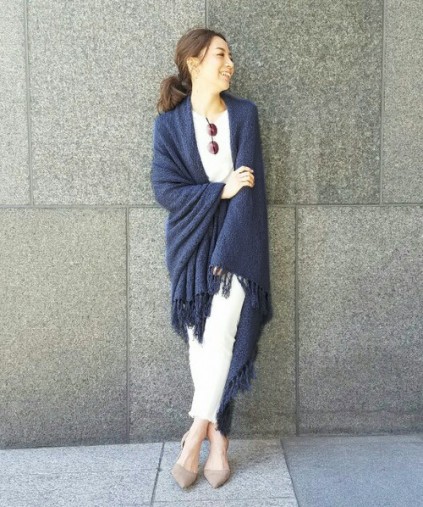 大判ストールをカーディガン風に羽織りましょう。首に巻くのはテクニックや巻き方の種類が多く難しいですが、一番簡単な方法が「羽織ること」。テクニックいらずで誰でも簡単にオシャレに見せることができ、袖を通すことがないのでボリューム袖にはぴったりです。  ストールをかけていると華奢に見え、女性的な魅力がアップ。「モテアイテム」なので、デートの時にもオススメです。