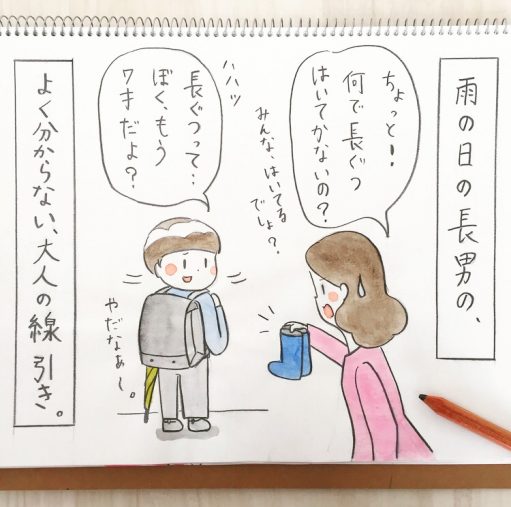 雨が降る朝、「長ぐつははかないよ」と言って登校しました。