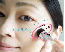 額から鼻筋にかけてT字型にハイライトを入れるのはもはや常識ですが、顔を縦長にみせたいときは、T字ではなくI字を額~鼻筋とアゴ下にいれましょう。額に横長のハイライトを入れると顔が横幅に見えてしまうからなんです。ただし、面長さんはT字型にハイライトを入れて顔の幅を横に出したほうがよいでしょう。