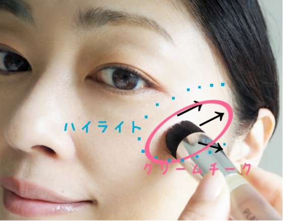 2. チークより少し広い範囲に、ハイライターをのせます(写真ブルーの点線)。ハイライトパウダーは、シルバーだと白浮きしてしまうことがあるので、ベージュ系を選ぶのがポイント。