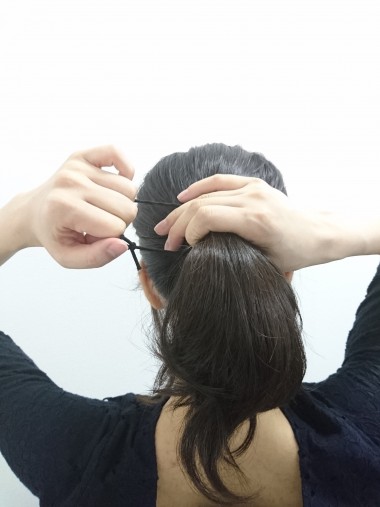 ・ゴムの結び目を押さえながら1センチ間隔で毛束を引っ張っていく