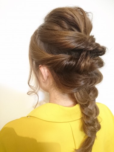 ④三つ編みの表面とくるりんぱを引っ張り出す