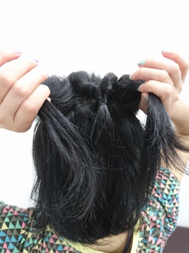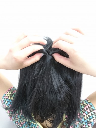②くるりんぱ(結んだ髪を割って穴をあけ、その穴に毛束を通すことを「くるりんぱ」と呼ぶ)