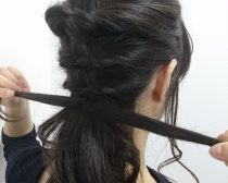 ・くるりんぱした部分も、しっかり結び目を押さえながら表面の毛束だけ引っ張り出す。その時に、分け目や地肌が見えていたら、その部分を隠すように緩めてあげる。