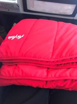 繰り返しになりますが、座席の広さや身体が倒せる角度の観点だと遜色はありませんでした。枕やブランケットもどちらも簡易なものではなく、ふんわりとしたカサのある枕、フェルト生地ではなくキルティング加工されたブランケットを借りることができました。本当にベッドに近い乗り心地です。