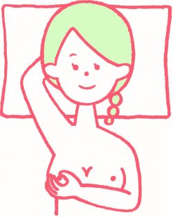 乳房が胸の上に平均に広がるように寝ます。指の腹で圧迫するように乳房やわきの下に触れた時、固くちいさなしこりがないか確認。