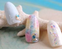 クラッシュシェルとオーロラは“夏ネイル鉄板コラボ”。夏の強い日差しの下でキラキラ輝き目立つこと間違いなしのデザインです。