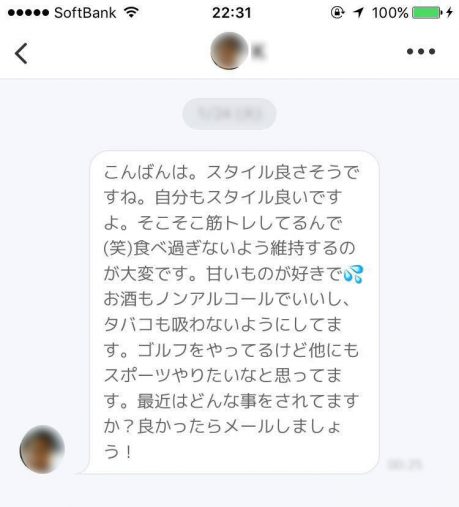 「新宿でSEしてます。2年間海外行ってました! 旅行好きですか? 休日はジム行ったり映画見に行くのが好きです」などと、長々と自己紹介を送りつけてくる人も一定層います。返信したいかどうか判断しやすいという点では無駄がなくよいですが、長すぎると読むのも疲れるし、読んだ結果、だいたい大したこと書いてないです。