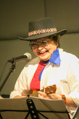 ウクレレの練習をする滝野さん。ここでも笑顔